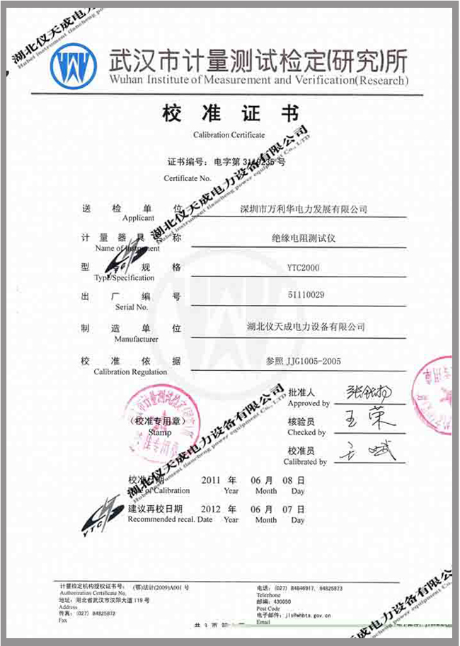 轉(zhuǎn)載:"YTC2000智能雙顯絕緣電阻測(cè)試儀鑒定證書" 請(qǐng)注明來(lái)源于儀天成電力。 更多技術(shù)問(wèn)題請(qǐng)致電儀天成電力客戶服務(wù):027-87876585,技術(shù)部專線:027-87876585,在線客服: