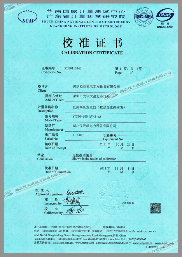 轉載:"YTCZG-200kV/2mA直流高壓發(fā)生器鑒定證書" 請注明來源于儀天成電力。 更多技術問題請致電儀天成電力客戶服務:027-87876585,技術部專線:027-87876585,在線客服:719388481